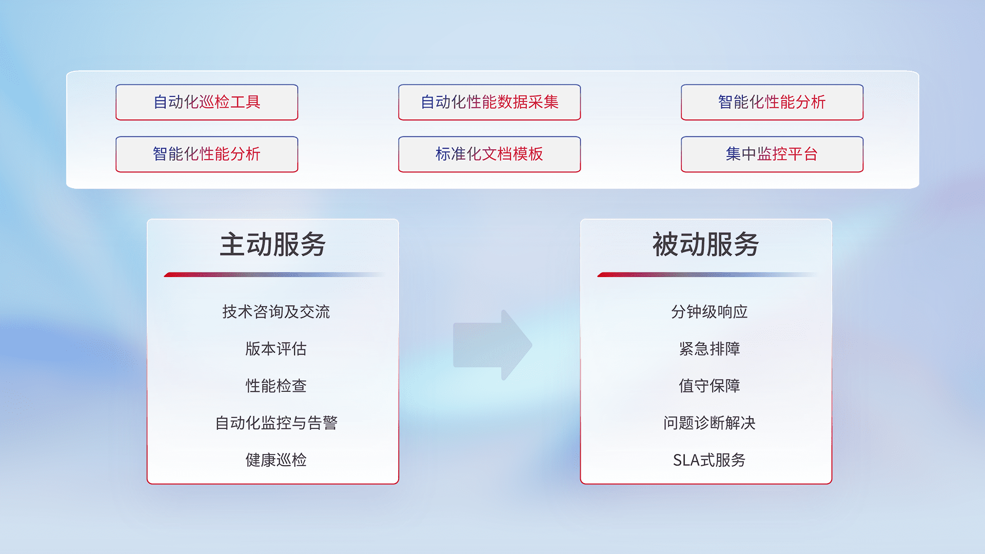 智能化工具和标准化文档,,,,保障服务质量,,,提供主动服务(包含技术咨询、、、、版本评估、、性能检查、、自动化监控与告警、、健康巡检)和被动服务包含(分钟级响应、、紧急排障、、值守保障、、、问题诊断解决、、、、SLA服务)。。
